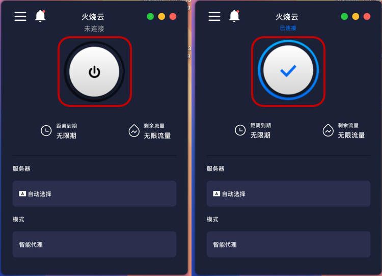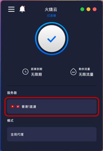 登录账号后进入主画面,点击【连接】即可成功连接加速器,再点击一次即结束连接。