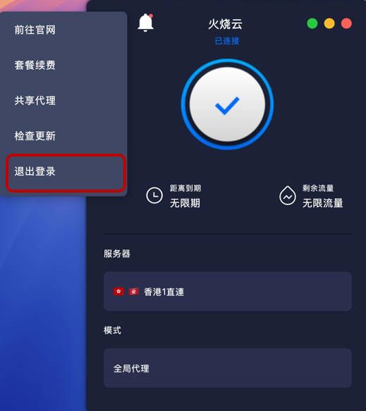 点击左上菜单,即可前往【套餐续费】及【退出登录】。