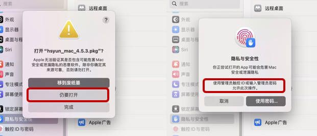 → 解决方法:请在下载火烧云客户端安装用pkg文件后,不要选取【移到废纸篓】,先至【系统设置】的【隐私与安全性】允许安装。