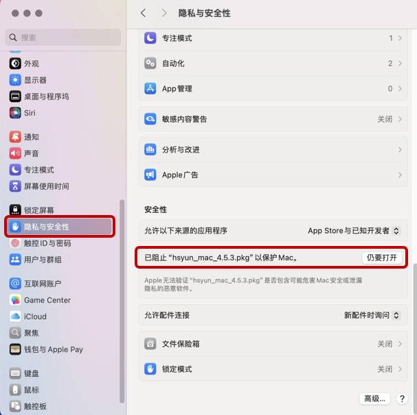 打开「系统设置」,找到「隐私与安全性」内的「安全性:允许以下来源的应用程序」,并选择【仍要打开】。