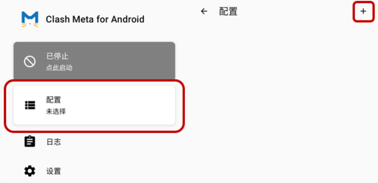 将您获取的个人专属订阅链接整串复制后,打开Clash Meta应用软件后,进入【配置】页面,点选右上角加号【+】。