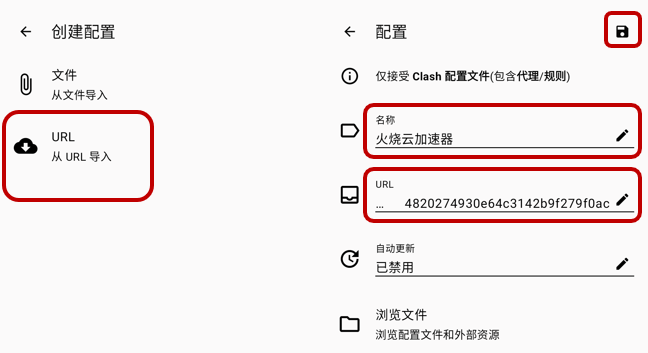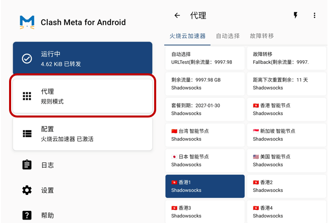 返回 Clash Meta 主页,进入【配置】处,选择并激活火烧云加速器。
