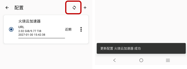 进入【配置】,点击右上角刷新按钮,可更新订阅节点。