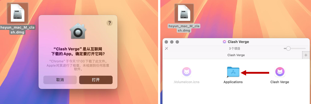 打开下载好的dmg文件,将 Clash Verge 拉进【应用程序 / Applications】文件夹。