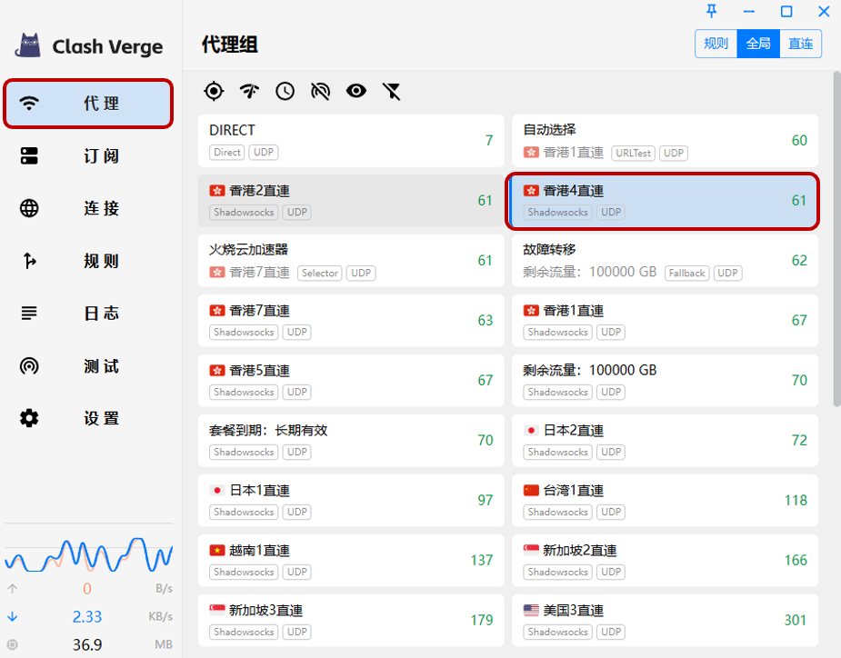 ⚠️ 連接時,请将代理模式切换至【全局模式】,并使用延迟小的节点