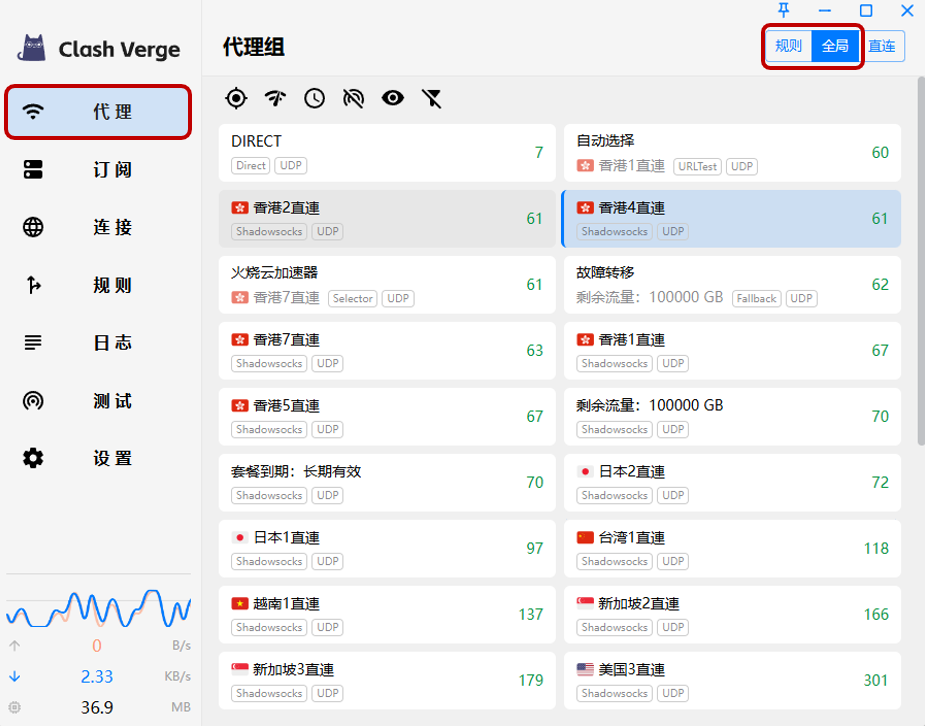 在【代理】页面右上角,可切换全局模式。
