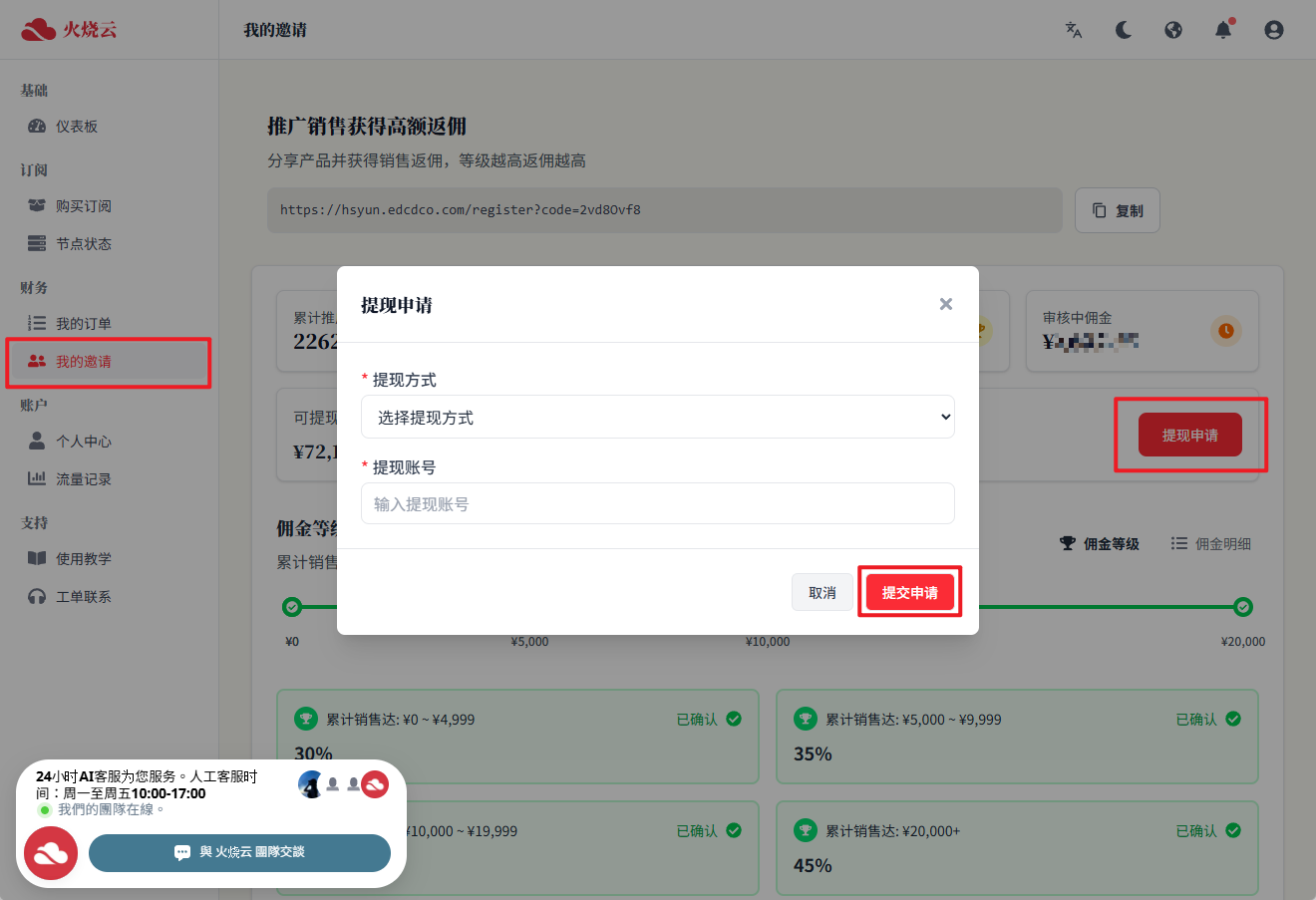 请访问 火烧云官方网站 ,找到【我的邀请】>【代理制度】右下角点选【申请成为代理】