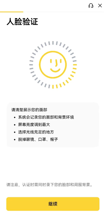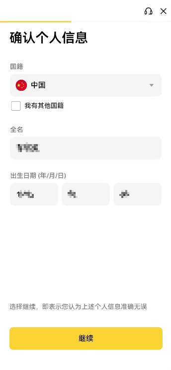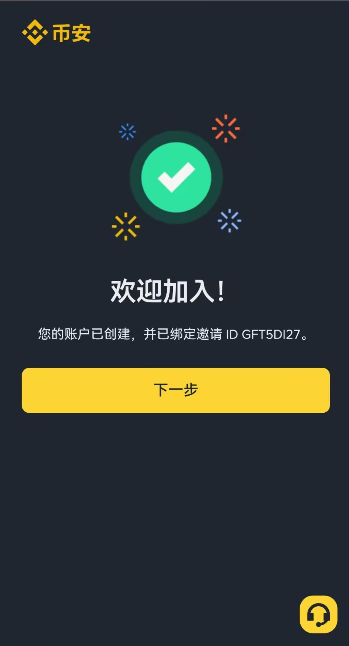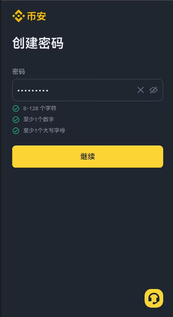 - 逐一完成条件会显示绿勾勾,再点击继续,币安账户及初步创建成功。