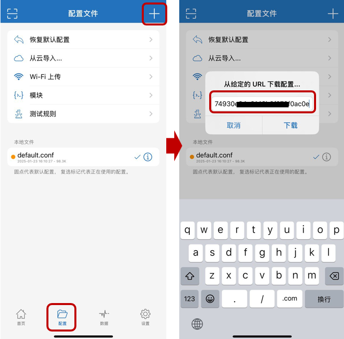iOS 的 Shadowrocket 小火箭,请到【配置】页面,点击右上角【+】后,于栏位中黏贴您的订阅链接,点选【下载】。