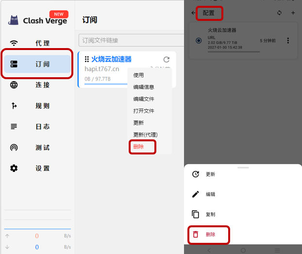 Windows 及 Mac 的 Clash Verge 版本,可在【订阅】页面找到,点右键选取【删除】即可。